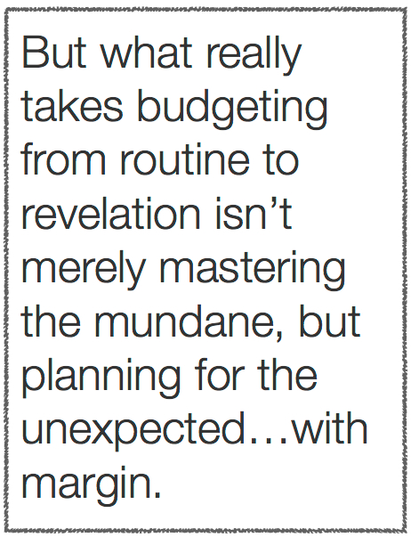 But what really takes budgeting from routine to revelation isn’t merely mastering the mundane, but planning for the unexpected…with margin. With the exception of bills that are identical every period, each variable budgeting category should have a built in buffer designed to weather slight variance. Then you should also have a separate miscellaneous buffer category for emergencies, auto repairs and other occasions that fall outside the bounds of your expectations.