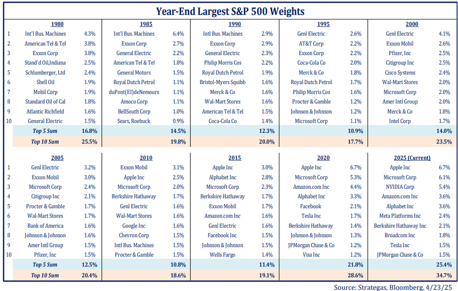 The table below shows the largest 10 stocks in the S&P 500 Index at the end of five-year periods starting in 1980. It’s fascinating to see how much the composition of the top 10 tends to shift through time.