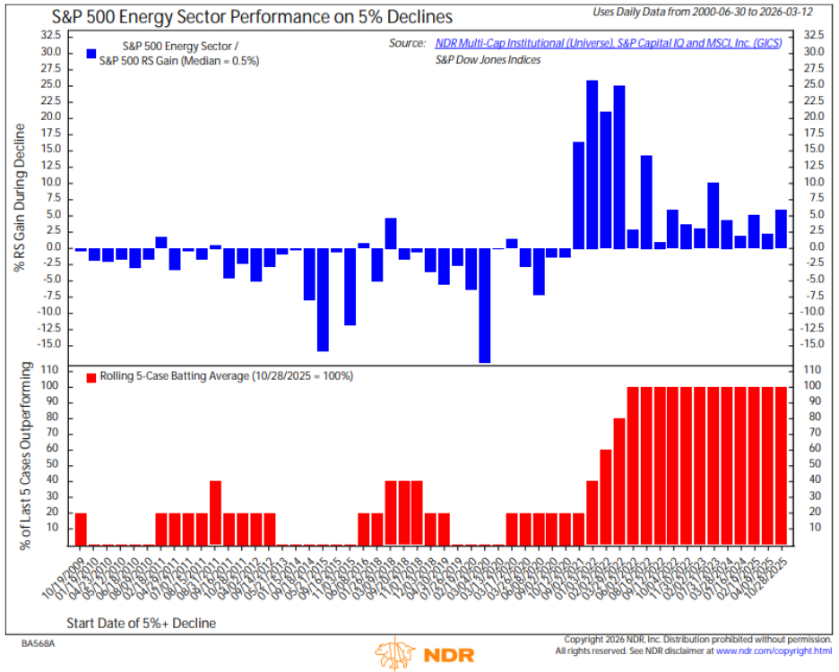 As the chart below shows, when the S&P 500 has been in a correction since the pandemic, Energy has been an outperformer. This underscores the shift from growth concerns to inflation concerns as a correction catalyst. The Iranian conflict is further emphasizing the negative role that inflation can have on markets. The chart also should serve as a reminder that market relationships are dynamic. An investor pre-2020 may never have guessed that Energy would be a consistent outperformer when the market is weak, but times can and do change.