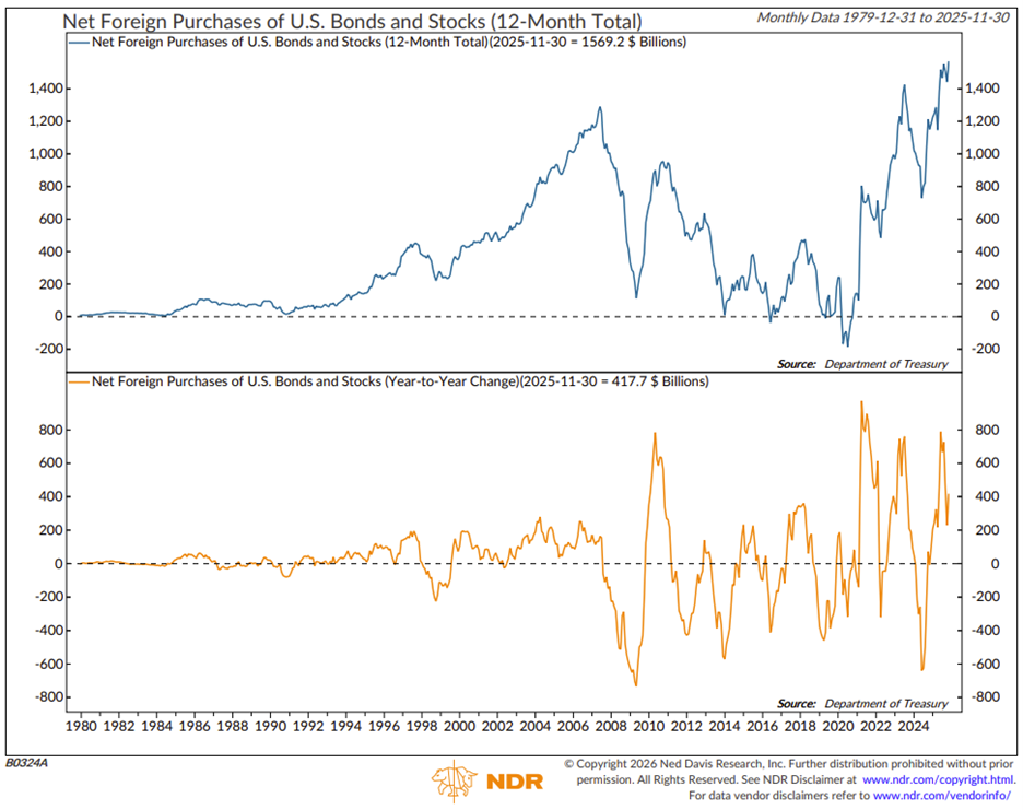 Recent dollar weakness and geopolitical headlines have prompted questions about whether something more structural is at play for the U.S. dollar. One useful way to pressure-test that concern is to look at where global capital is actually flowing. Over the past 12 months, foreign investors purchased roughly $1.6 trillion of U.S. stocks and bonds, the highest level on record.