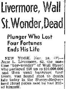 Actually, the headlines on Friday, November 29th, 1940 read, “Livermore, Wall St. Wonder, Dead.”[i] I was recently re-acquainted with Jesse Livermore’s story—that of a self-made trading savant whose early-life exploits were regaled in a series of articles turned classic work of historical fiction, Reminiscences of a Stock Operator, by Edwin Lefevre[ii]. The volume is still handed out as a guide book to new traders every year, an ironic tradition considering the book was written as a cautionary tale.