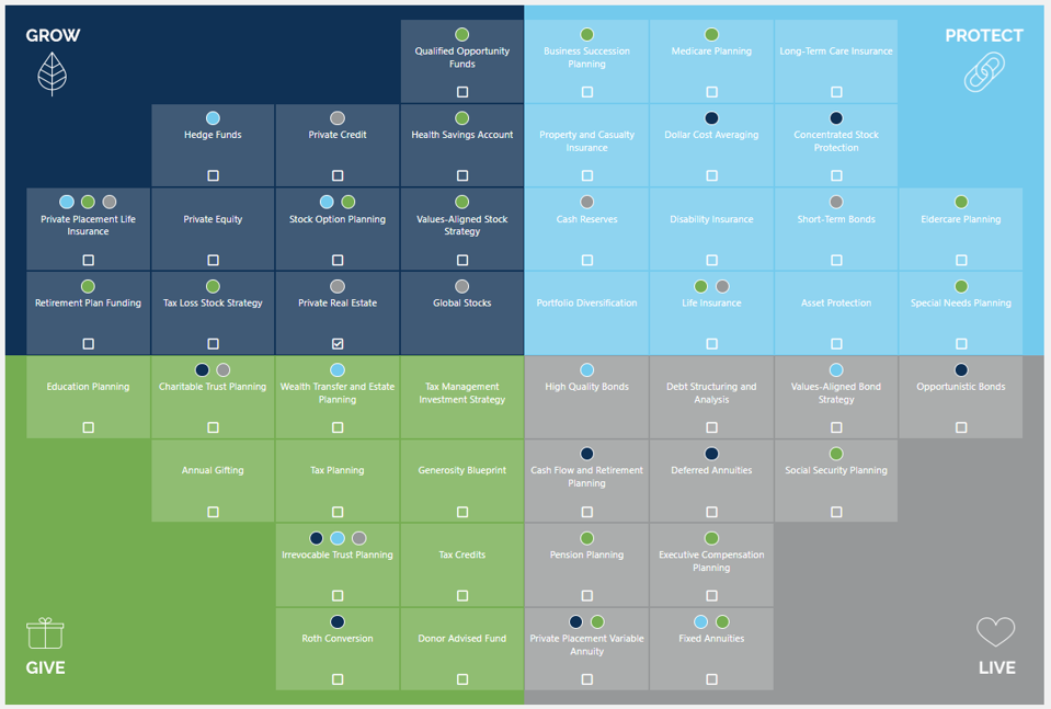 Here's an example of a reordering of wealth management through this elemental lens, where the color coding denotes areas of overlap, indicating where individual strategies may offer benefits from more than one pillar of planning: