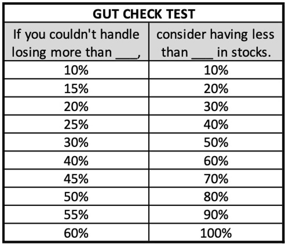 Instead, consider acknowledging this reality—and your own personal willingness to endure risk. Then offset the growth engine of your portfolio—your exposure to stock—with the stabilizing agent of the most conservative, boring fixed income or bonds. Consider the following gut check test, the goal being to match your maximum tolerable loss with an appropriate maximum equity exposure: