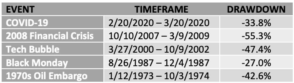 Let’s look at some of the scariest market moments of the past 50 years, specifically how far the market—in this case, the S&P 500—dropped over a handful of notable time periods: