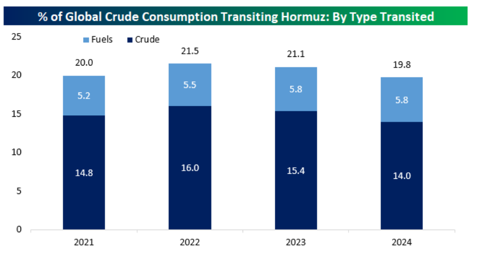 The focus remains on the Strait of Hormuz, a critical chokepoint through which roughly 20% of global petroleum supply flows. As the chart below highlights, this exposure has remained relatively steady over time. In most scenarios, including continued negotiations or a limited military action, the impact on oil prices would likely be temporary. The more disruptive outcome would involve a broader escalation that threatens energy flows through Hormuz, potentially tightening global supply more materially.