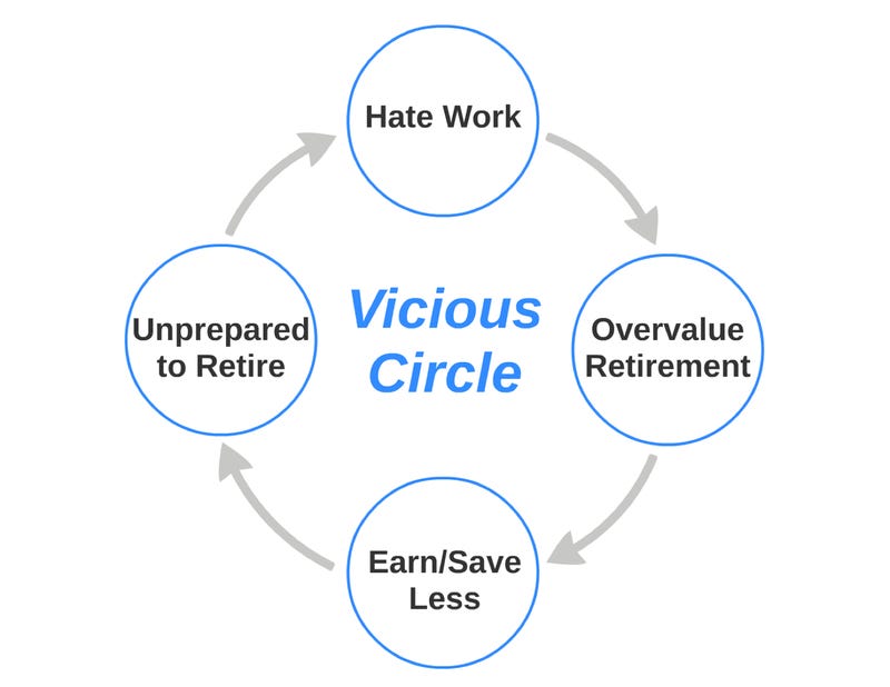It’s a vicious circle: If you don’t like your work, you’re likely to overvalue retirement. But if you undervalue you’re work, it’s logical to assume your performance will be less than optimal and, therefore, that your wages—your retirement savings engine—will be suppressed.