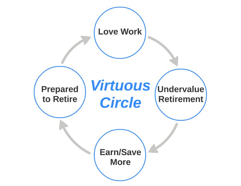 But there’s a virtuous circle to counter: If you love your work, it’s likely that you undervalue retirement. But ironically, because you love your work, it’s logical to assume your lifetime performance is improved and your lifetime earnings (and savings potential) are increased, better preparing you for retirement.