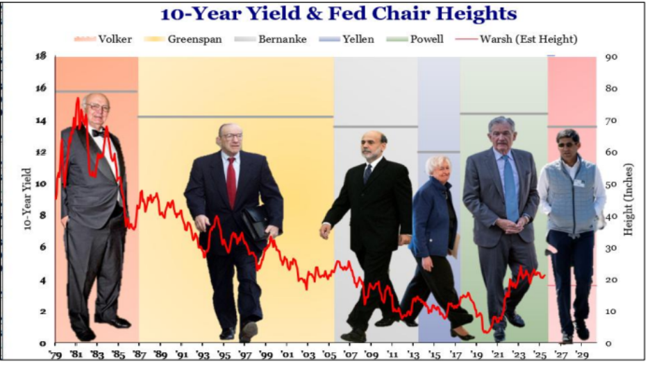 One interesting chart is the apparent correlation between changes in Fed chair height and interest rates. As Fed chairs continuously came in shorter than Volcker, rates were falling. Jay Powell bucked that trend of progressively shorter chairs and wouldn’t you know it, rates moved sustainably higher for the first time since Volcker’s tenure! Warsh is shorter than Powell, so just maybe we’ll get a new period of lower rates in the years ahead.