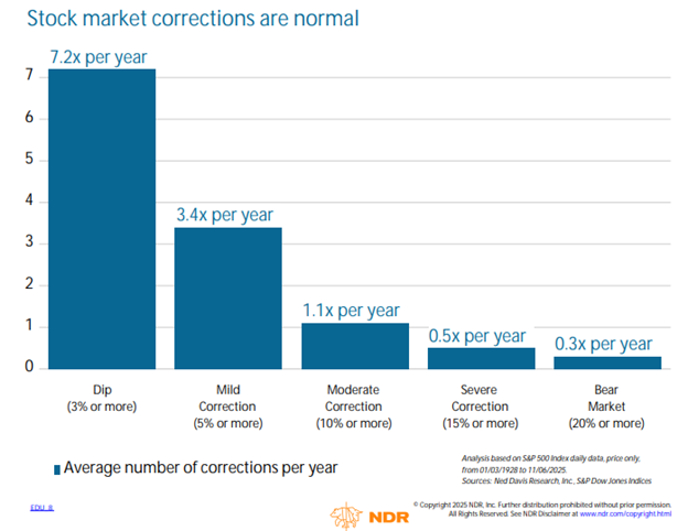 We agree that valuations are pretty rich, but the process of correcting and then rallying is a pattern as old as the stock market itself. Importantly, Ted Pick, CEO of Morgan Stanley, also called these corrections a healthy development, to which we agree. A 10%+ correction tends to reset investor sentiment, setting a base for the next leg higher. Is it fun to watch your account balances correct double-digits? Of course not. But we hold stocks for long-term growth, not for near-term spending needs. If we know that we should expect one of these corrections at least once a year helps to arm us with the ability to normalize it and stay the course.