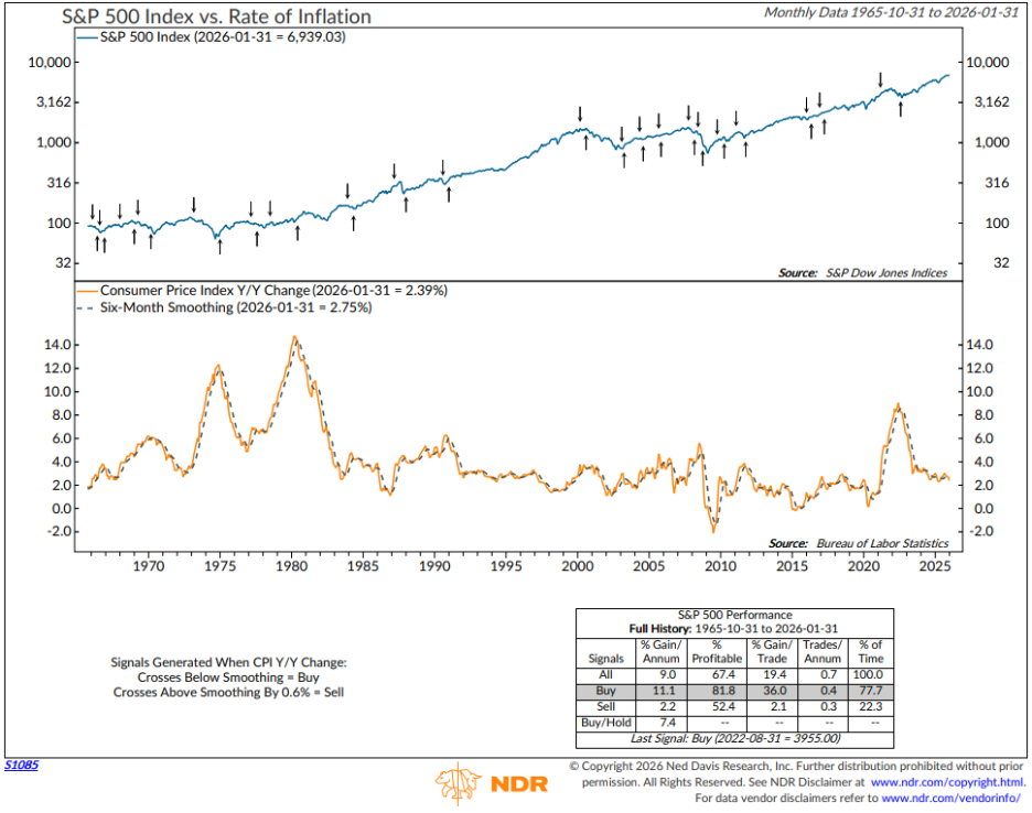 The chart below shows that this bull market, which began in 2022, has been underpinned by an easing rate of inflation. The market low occurred near the peak in the inflation rate. Note that when the rate of inflation has been falling, the S&P 500 has appreciated by 11% per year on average. When it has been accelerating, the market has dipped by -2% per year on average.