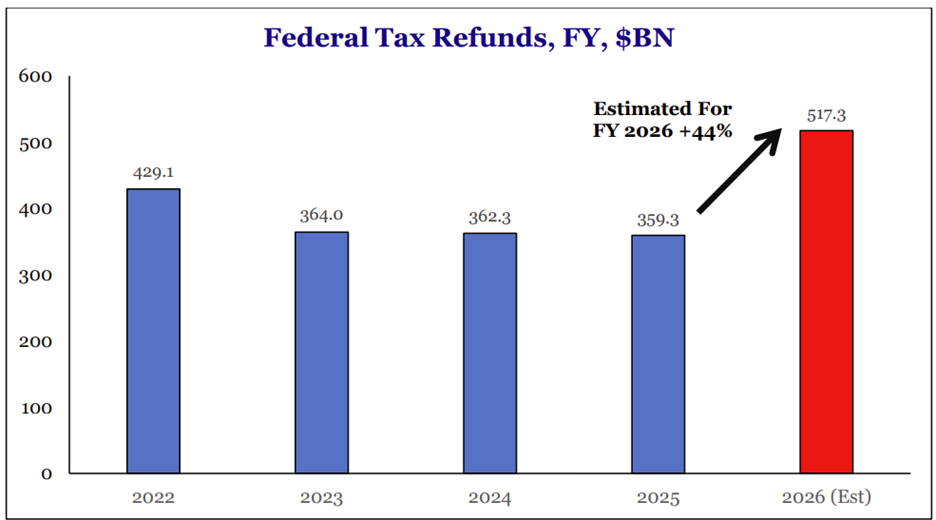 In the next section, we highlight the labor market and some signs of deterioration. We expect slower economic growth in Q4, largely due to the challenging job market. But the potential good news is that help for consumers is on the way in 2026, both in the form of a lower Fed policy rate, and also, from the increase in tax refunds following the passage of the OBBBA.