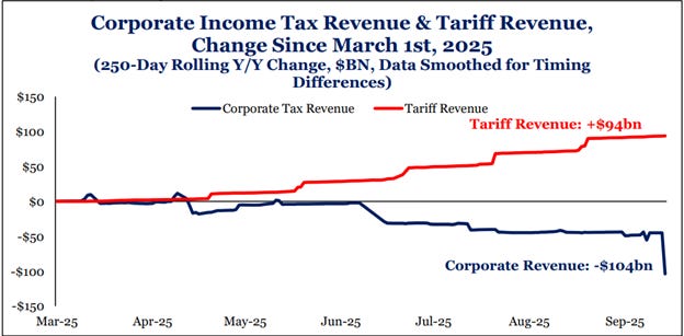 The market had to deal with a healthy dose of spinach before it got any candy this year. The Liberation Day tariff announcements created a major headwind back in April. But on July 4th, the One Big Beautiful Bill Act was signed into law, with the potential to sterilize the tariff collections. The chart below shows that the change in corporate income tax collection has fallen by $104 billion in the last 12 months, while tariff collections have grown by $94 billion.