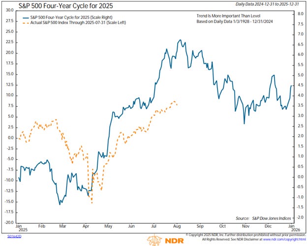 Their pattern reminds me of the stock market seasonal cycle. Combined, August and September have tended to be the worst two-month stretch for U.S. stocks. That trend has been particularly amplified in the first year of a four-year Presidential cycle. The blue line in the chart below shows the average pattern for the S&P 500 Index in all first Presidential years. The dashed orange line is the index thus far in 2025. Note that on average, the market has experienced a correction that began around the beginning of August.