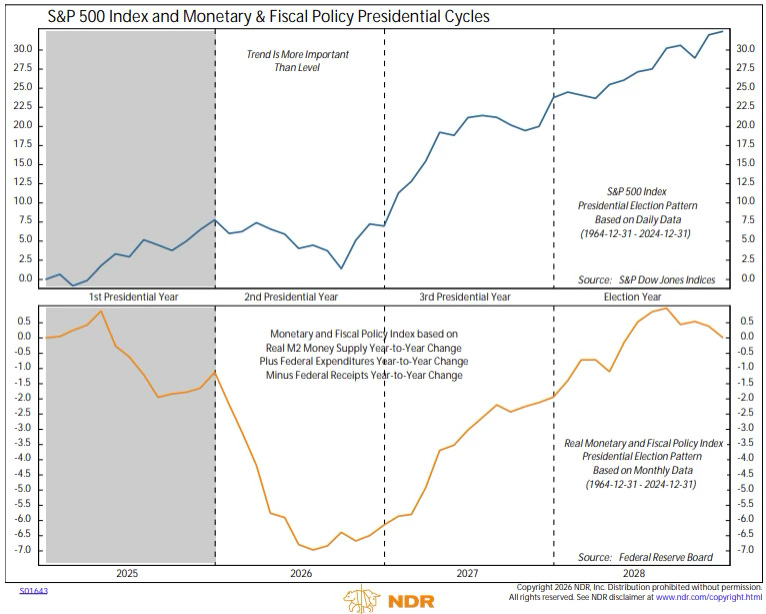 Historically, midterm election years have been the most challenging for U.S. stocks in the four-year presidential cycle. In fact, the market has barely averaged a gain and tended to see double-digit corrections into the Fall. The pattern is not random. Rather, it can be explained by the corresponding pattern in monetary and fiscal policy. The chart below shows the average trend for the S&P 500 Index in blue, throughout the four years in a presidential term. The bottom clip, in orange, shows the pattern of monetary and fiscal stimulus. Note that in the second year, the policy has tended to be quite restrictive before ramping up in year three ahead of the reelection campaign. But that is far from the pattern we expect this year.