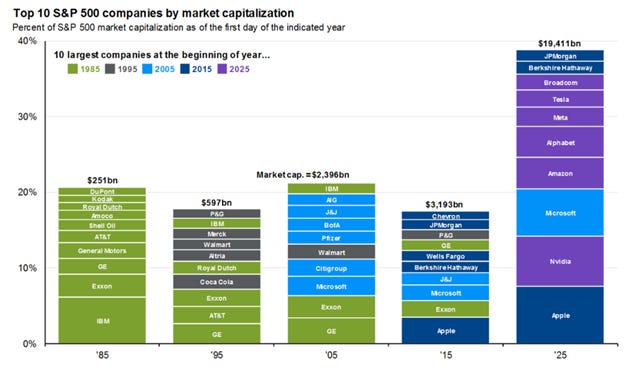 This week’s chart highlights how the composition of the top 10 companies in the S&P 500 has evolved over time. In 1985, the list was dominated by industrial and energy giants like Exxon, GE, and DuPont. By 1995, consumer brands such as Coca-Cola, P&G, and Walmart had taken center stage. A decade later, in 2005, financials like Citigroup and Bank of America were among the largest. Fast forward to 2025, and technology and platform companies, such as Apple, Microsoft, Nvidia, Amazon, and Alphabet account for an unprecedented share of total market capitalization.