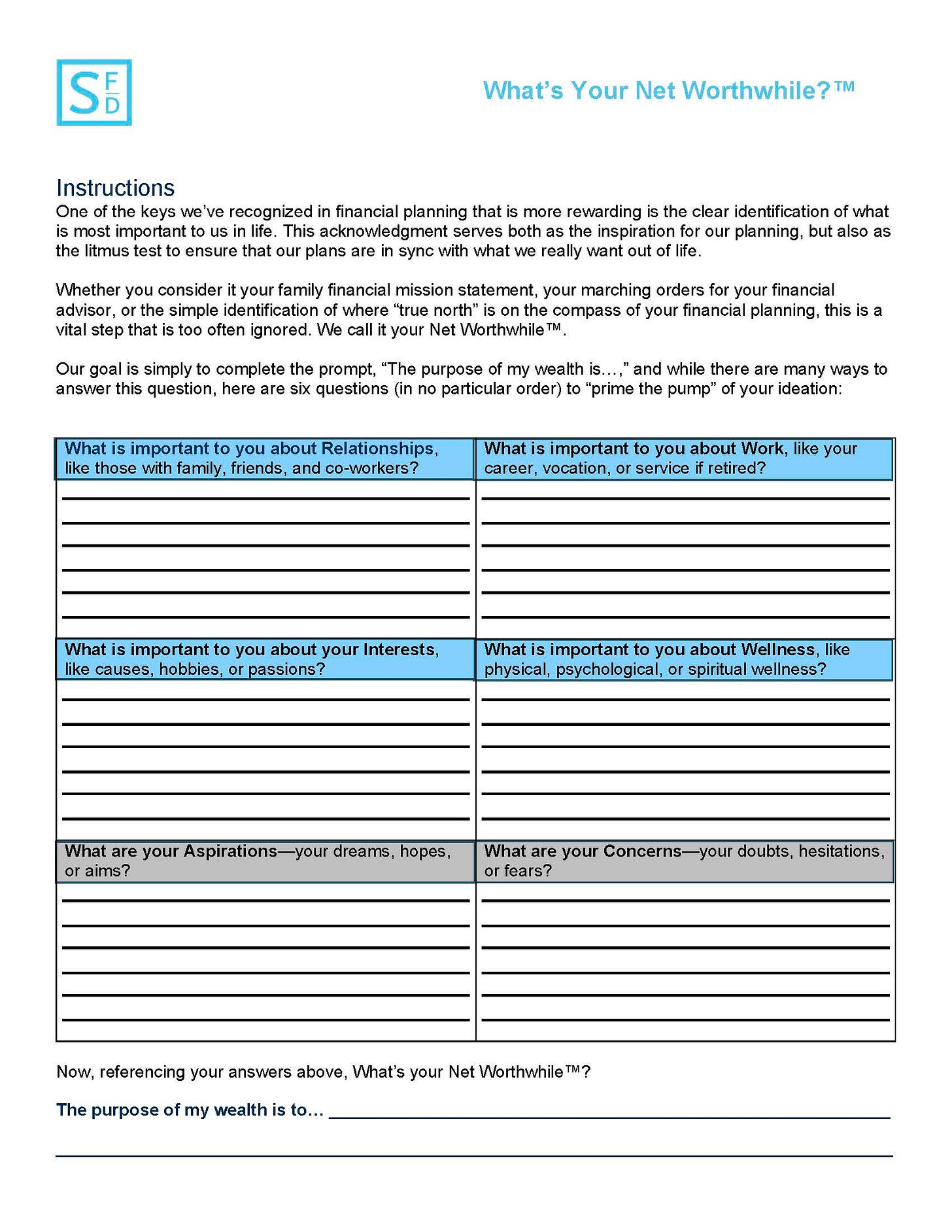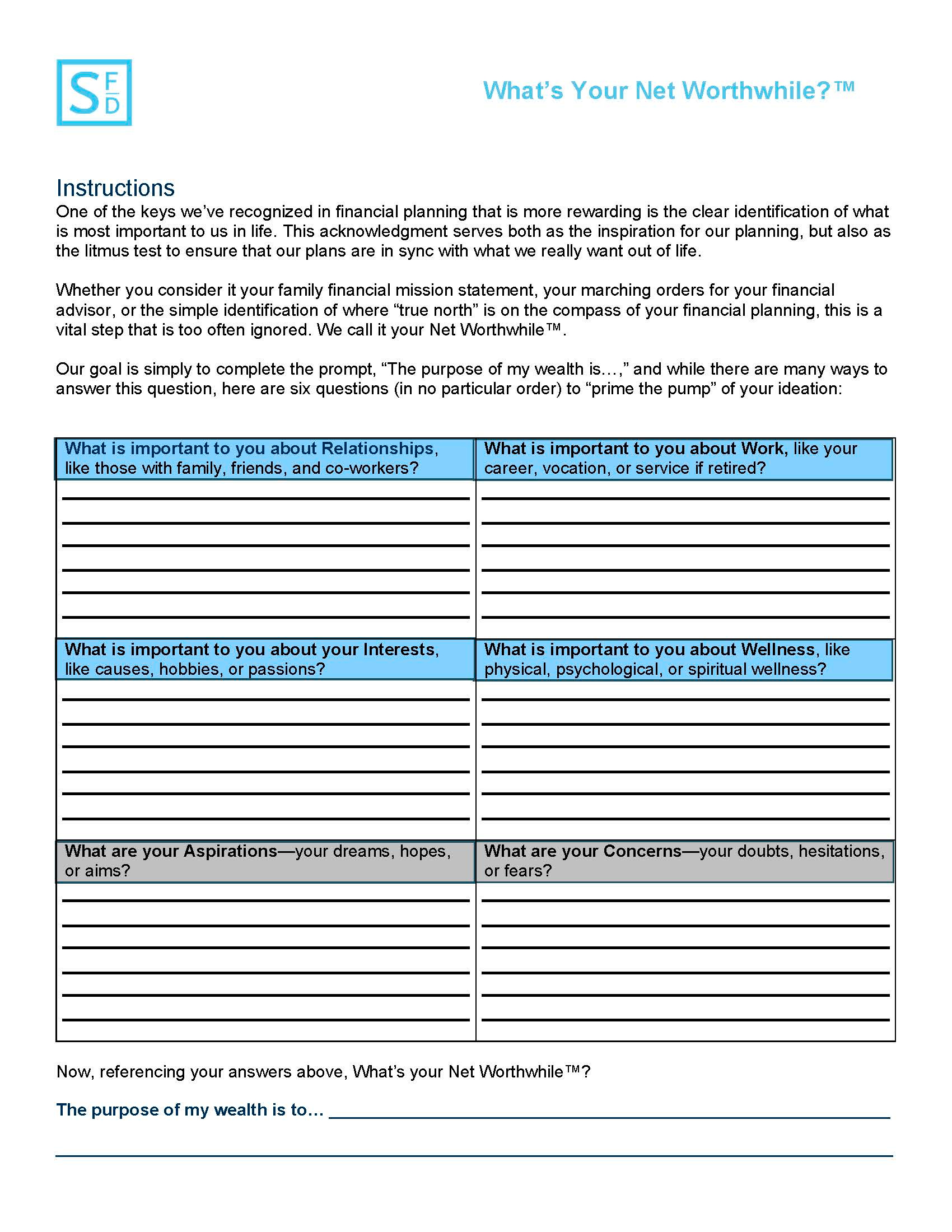 Of course, one of the challenges with this question is that it, too, can be pretty open-ended, so I created an exercise (below) that allows you to limit the seemingly infinite range of response options to six simple prompts that should help you excavate the raw materials necessary to complete the sentence above, defining your Net Worthwhile®.