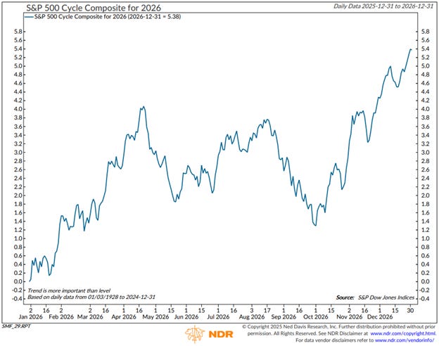 Ned Davis Research’s 2026 S&P 500 Cycle Composite points to a familiar but uneven pattern for the year ahead: strength early, weakness in the middle, and a constructive finish. The composite blends three long-running historical influences – the one-year seasonal cycle, the four-year presidential cycle, and the ten-year Juglar (intermediate-term business) cycle – and suggests an uptrend carrying into late Q1 or early Q2, followed by a choppier and weaker Q2–Q3 period, before a year-end rally takes hold. Importantly, NDR emphasizes that with cycle analysis, the trend matters more than the precise magnitude, making the sequencing of returns more informative than point estimates.